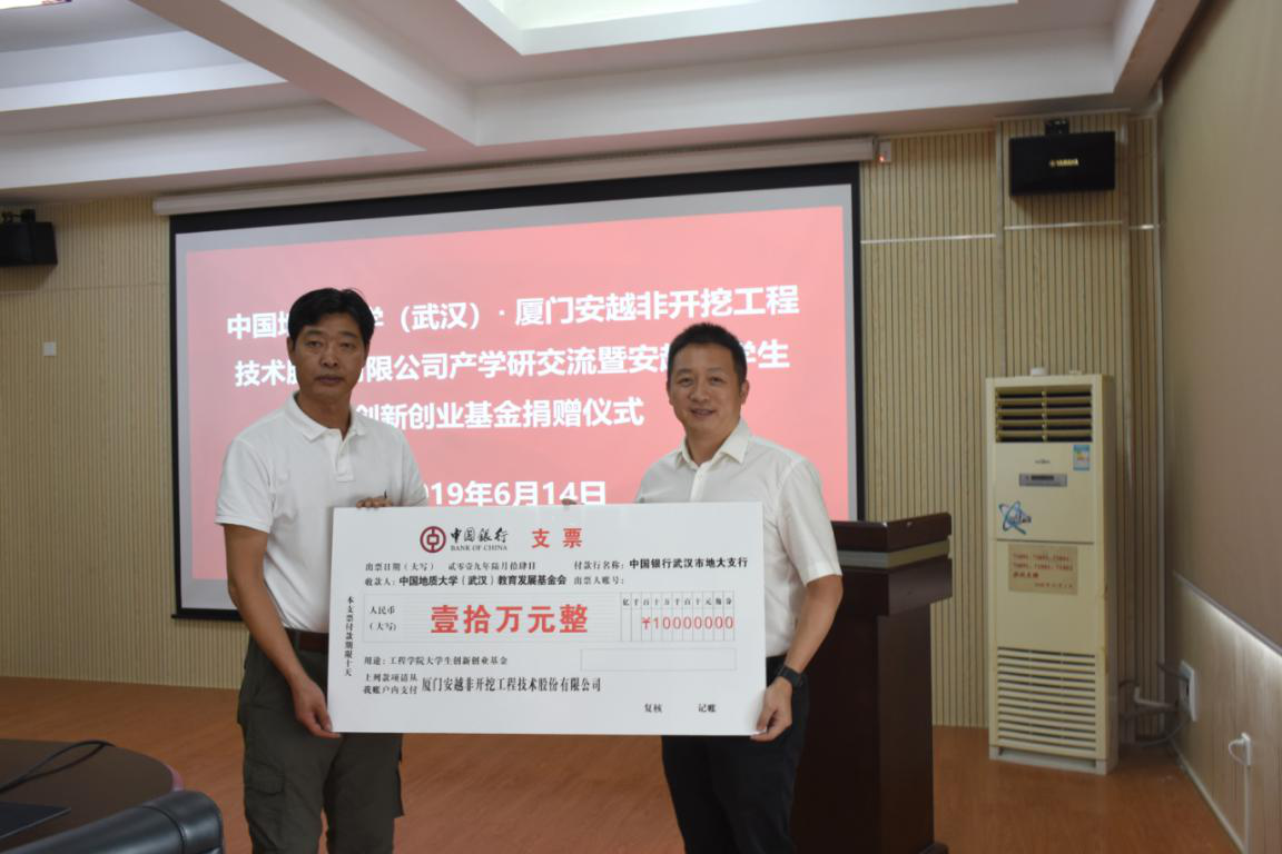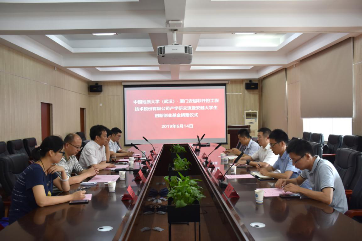 2019年6月14日上午,厦门安越非开挖技术股份有限公司来校作产学研交流,并捐赠10万设立安越老员工创新创业基金,捐赠仪式在315举行。厦门安越非开挖技术股份有限公司董事长廖宝勇一行、武汉中地大非开挖研究院有限公司总经理孔耀祖,员工工作与教育基金管理处副处长吕占峰、丁苗苗,公司党委书记陈飞、党委副书记江广长、副教授曾聪参加会议。江广长主持会议。