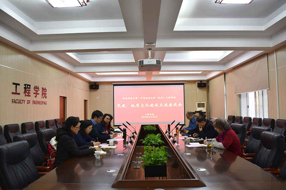 (通讯员:杨冠青)2019年11月25日上午,西南科技大学环境与资源公司(以下简称“环资公司”)副书记陈莉等一行5人来公司进行党建、地质文化建设交流座谈,公司党委副书记江广长,副经理窦斌,工程地质与岩土工程系党支部书记贾洪彪,党委委员组织人事秘书杨冠青参加了座谈。会议由窦斌主持。