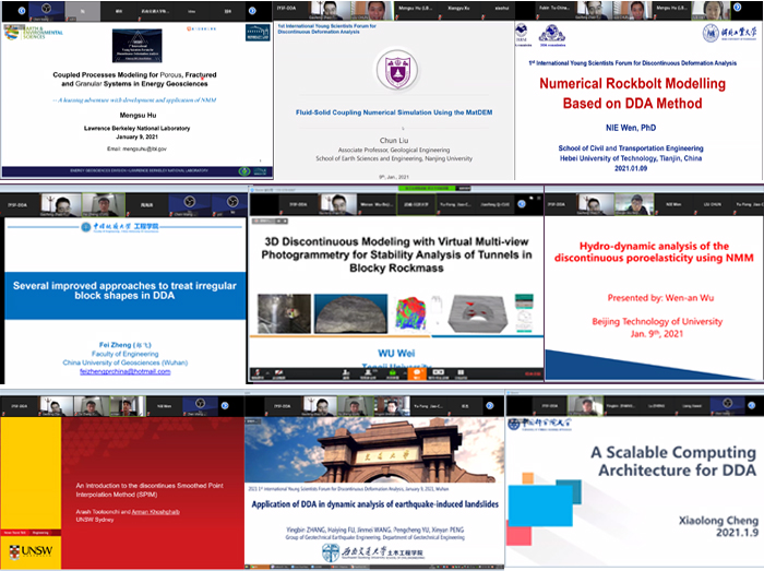 (通讯员:吕加贺 张美霞)2021年1月9日,由国际岩石力学与岩石工程学会非连续变形分析专委会(ISRM DDA Commission)、ISRM中国国家小组(ISRM NG China)、中国岩石力学与工程学会岩土体非连续变形分析专委会(CSRME DDA Commission)联合发起,best365英国体育在线(武汉)、天津大学和河北工业大学联合承办的第一届非连续变形分析国际青年科学家论坛(1st International Young Scientists Forum for Discontinuous Deformation Analysis, IYSF-DDA)在Zoom会议平台成功举办,并于矿业人网站、哔哩哔哩平台同步直播,超过350人全程参加了此次非连续变形分析领域的学术盛宴。此次会议主要邀请了岩石力学与工程非连续变形分析领域青年学者,旨在交流非连续变形分析方法的前沿理论和最新研究进展,同时分享岩石力学与工程中非连续变形分析典型工程案例。