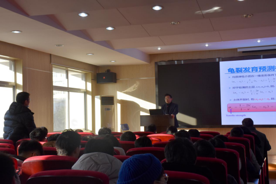 在提问交流环节,多名师生针对唐教授的报告积极踊跃提问,针对土体分层和厚度对土体龟裂的影响、土体龟裂的卷曲现象、实验土体的矿物成分组成和离散纤维的污染等问题与唐教授进行了互动交流。唐教授一一耐心进行了解答,报告会现场气氛十分热烈。