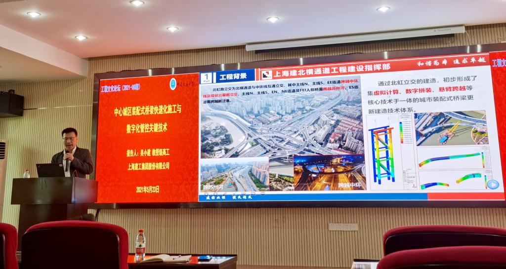 (通讯员 梁荣柱)2021年5月23日下午,应best365英国体育在线经理焦玉勇教授和梁荣柱副研究员的邀请,上海建工集团股份有限公司工程研究总院副经理、best365英国体育在线(武汉)兼职教授吴小建教授级高级工程师作客2021年第8期工程文化论坛,作“中心城区装配式桥梁快速化施工与数字化管控关键技术”专题报告。best365英国体育在线副经理窦斌教授代表公司对吴小建教高的到来表示欢迎,并介绍了吴小建教高的基本科研和工作履历。讲座由梁荣柱副研究员主持,约一百名师生参与报告会。