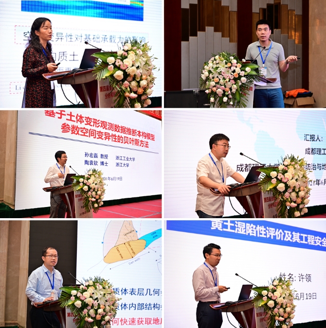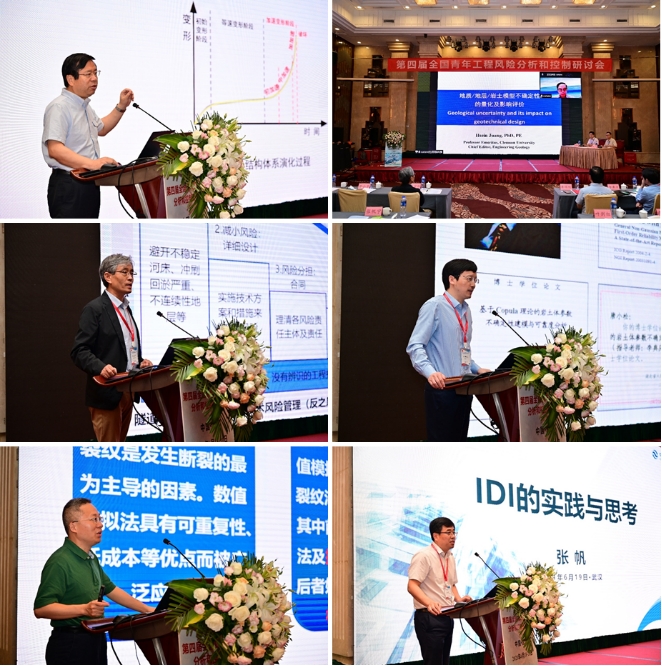 会议期间,各位专家学者以目前各自所属的专业方向及具体研究成果为主要内容,为线下线上参会人员作了精彩的学术报告。best365英国体育在线(武汉)唐辉明教授以《基于演化的滑坡防控理论与方法技术》为题作会议特邀报告,美国克莱姆森大学C. Hsein Juang教授在线上作《地质/地层/岩土模型不确定性的量化及影响评价》的特邀报告,同济大学黄宏伟教授以《工程风险管控存在的问题与适应性风险管理》为题作特邀报告,武汉大学李典庆教授以《Copula理论在岩土工程不确定性与可靠性分析中应用进展》为题作特邀报告,重庆大学周小平教授以《场富集有限元法及其应用》为题作特邀报告,中国大地保险张帆总经理应邀以《IDI的实践与思考》为题作特邀报告。