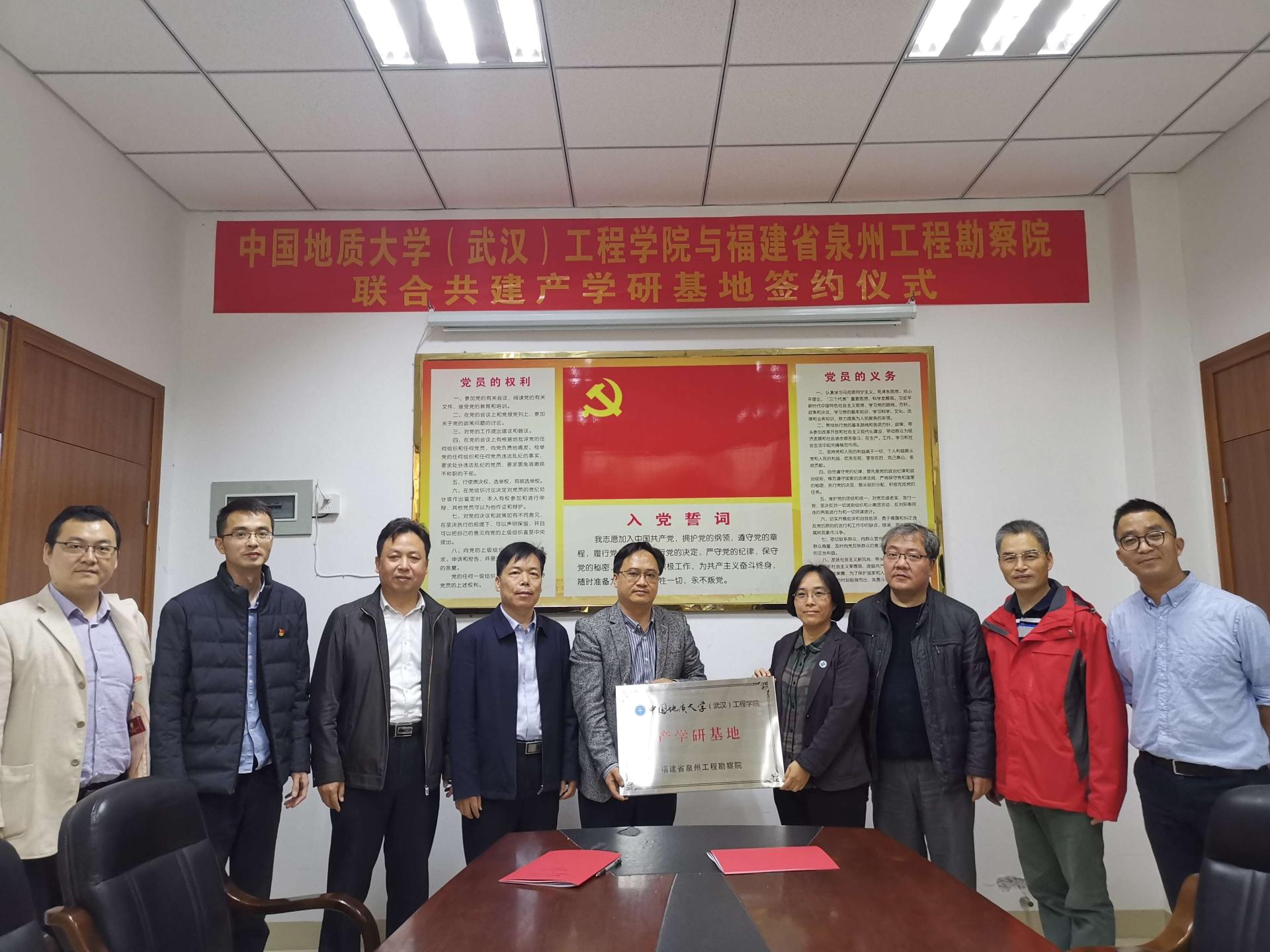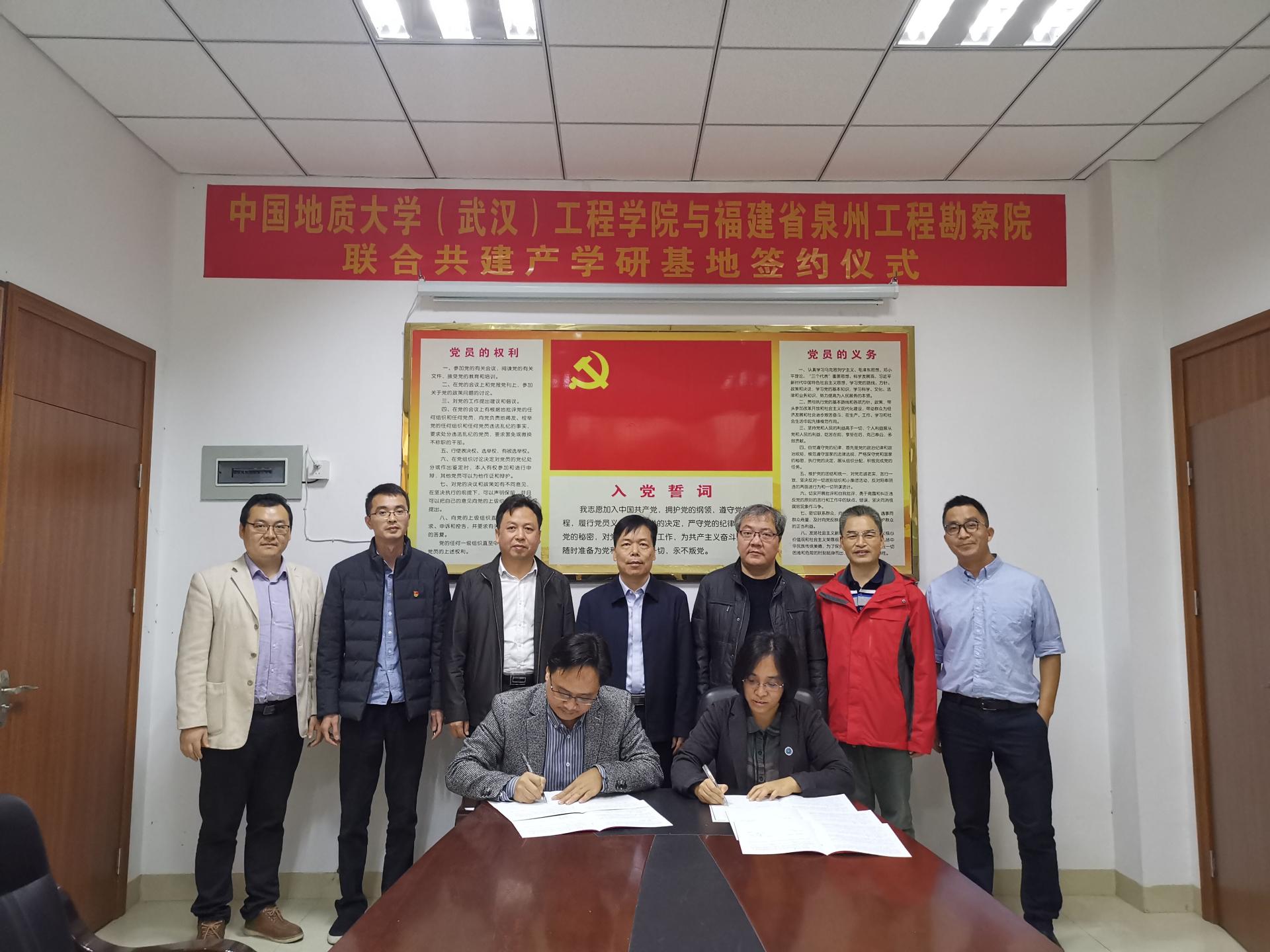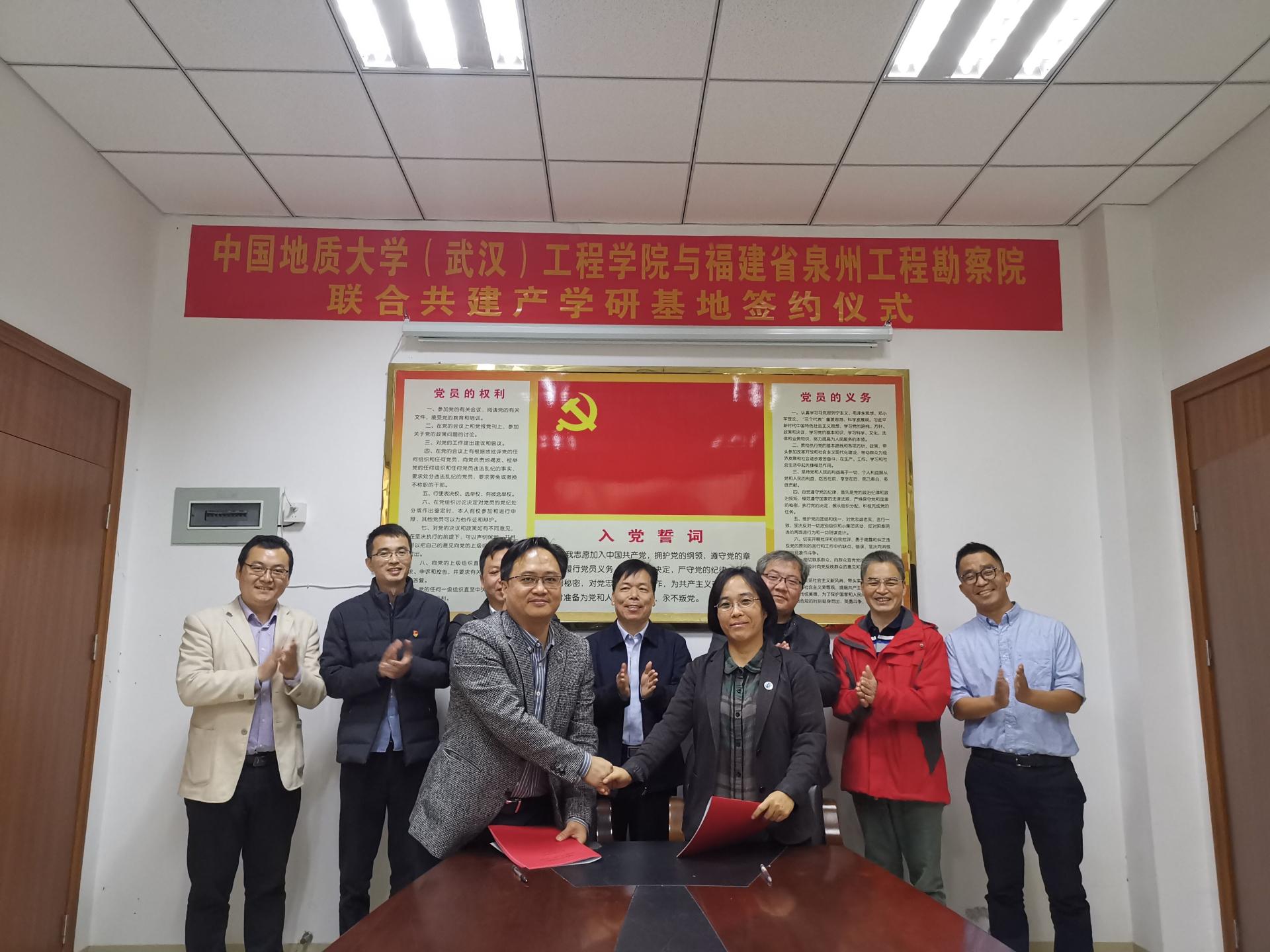 (通讯员:任兴伟)为进一步提升院科研创新实力,培养储备高素质专业化技术人才,经过前期接洽,12月17日,best365英国体育在线(武汉)best365英国体育在线与福建省泉州工程勘察院产学研合作签约仪式在泉州举行。best365英国体育在线(武汉)公司党委书记李红丽、副经理王亮清、工程地质与岩土工程系副主任简文星,福建省闽东南地质大队队长林建开、副队长陈守伟、泉州工程勘察院经理曾文杰、副经理蔡伟等领导出席签约仪式。
