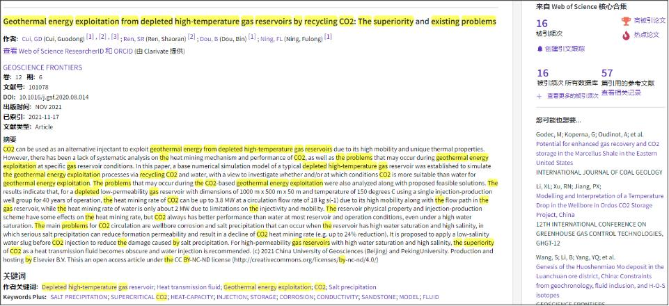 (通讯员:黄静)根据2022年3月基本科学指标数据库(Essential Science Indicators,简称ESI)最新数据显示,公司崔国栋副教授于2021年在国际地学期刊Geoscience Frontiers上发表的学术论文“Geothermal energy exploitation from depleted high-temperature gas reservoirs by recycling CO₂: The superiority and existing problems”入选ESI热点和高被引论文(Hot and Highly Cited Paper)。该论文第一作者兼通讯作者为崔国栋副教授,best365英国体育在线(武汉)best365英国体育在线为第一署名单位。