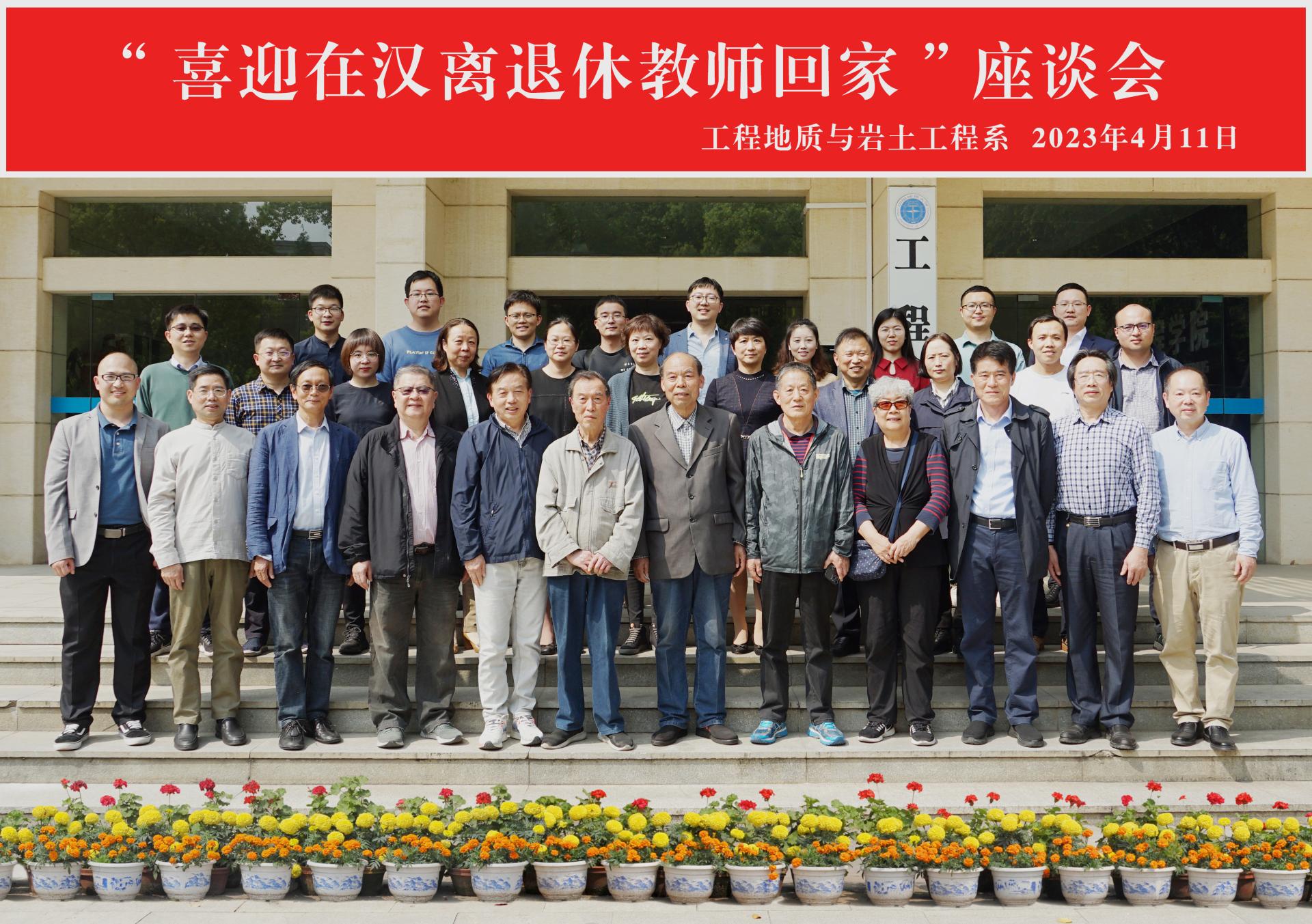 (通讯员 黎伟 王灿)2023年04月11日(周二)下午,工程地质与岩土工程系在工程楼201会议室举行了“喜迎在汉离退休教师回家”座谈会。六位系离退休老教师(孟高头、杨顺安、张瑛玲、刘昌辉、余宏明和项伟)以及系中青年教师参加了本次座谈会,座谈会由系党支部书记葛云峰主持。活动开始前,与会教师在工程楼门前集体合影。