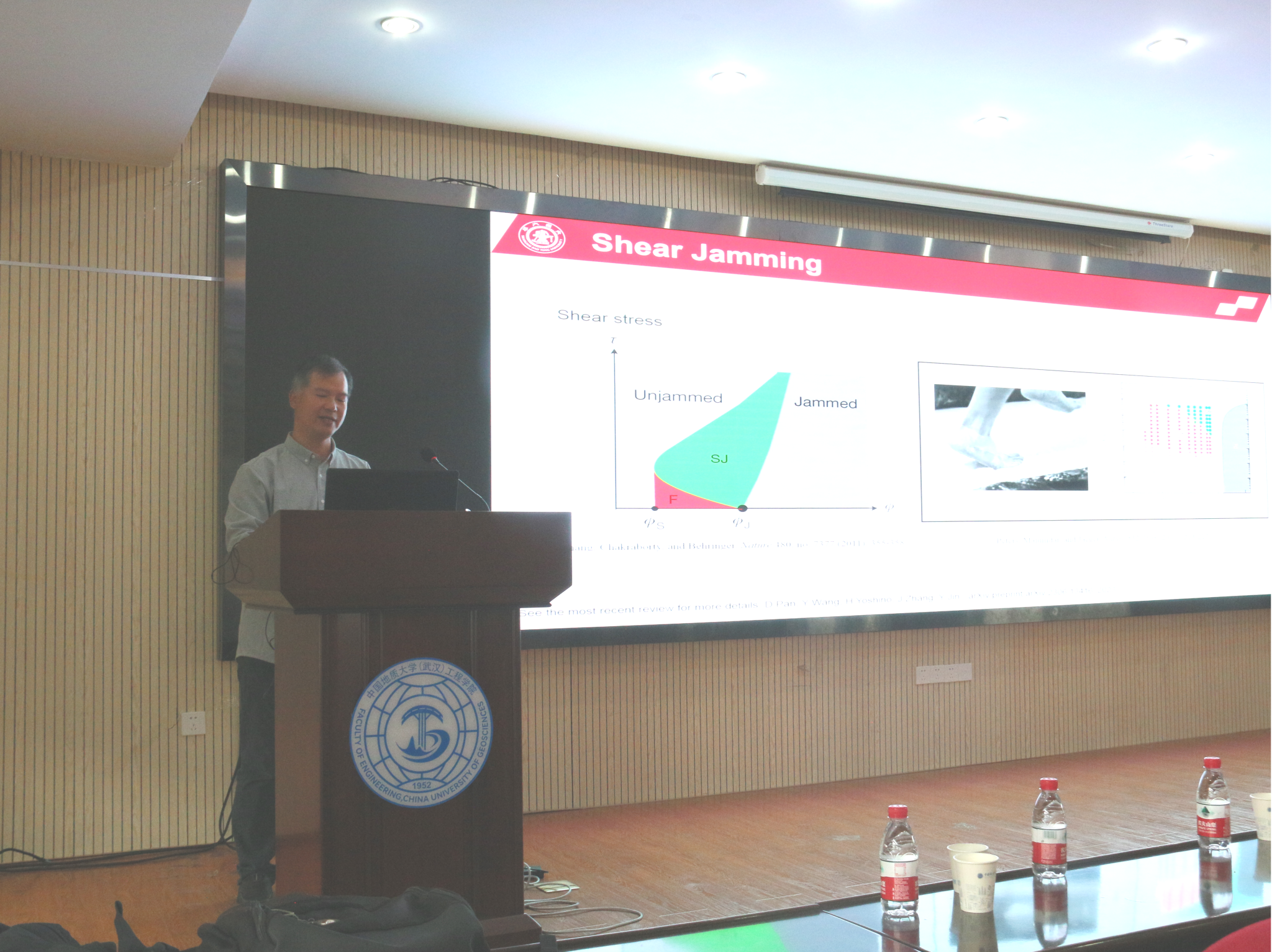 张洁教授以“The yielding of granular matter is marginally stable and critical”为题,主要讲述了颗粒物质的边缘临界性与其屈服的关系。颗粒物质在稳态和非稳态之间存在一个临界态,在循环纯剪切作用的堵塞堆积接近屈服点时可能出现这种临界态。张洁教授与其团队对光弹性颗粒物质进行了纯剪切实验,发现颗粒物质的屈服转变是临界态,满足临界力学稳定性条件,并且弱力链与颗粒间空隙之间存在幂律分布关系。研究结果有助于理解在无定形固体中屈服的复杂性质。