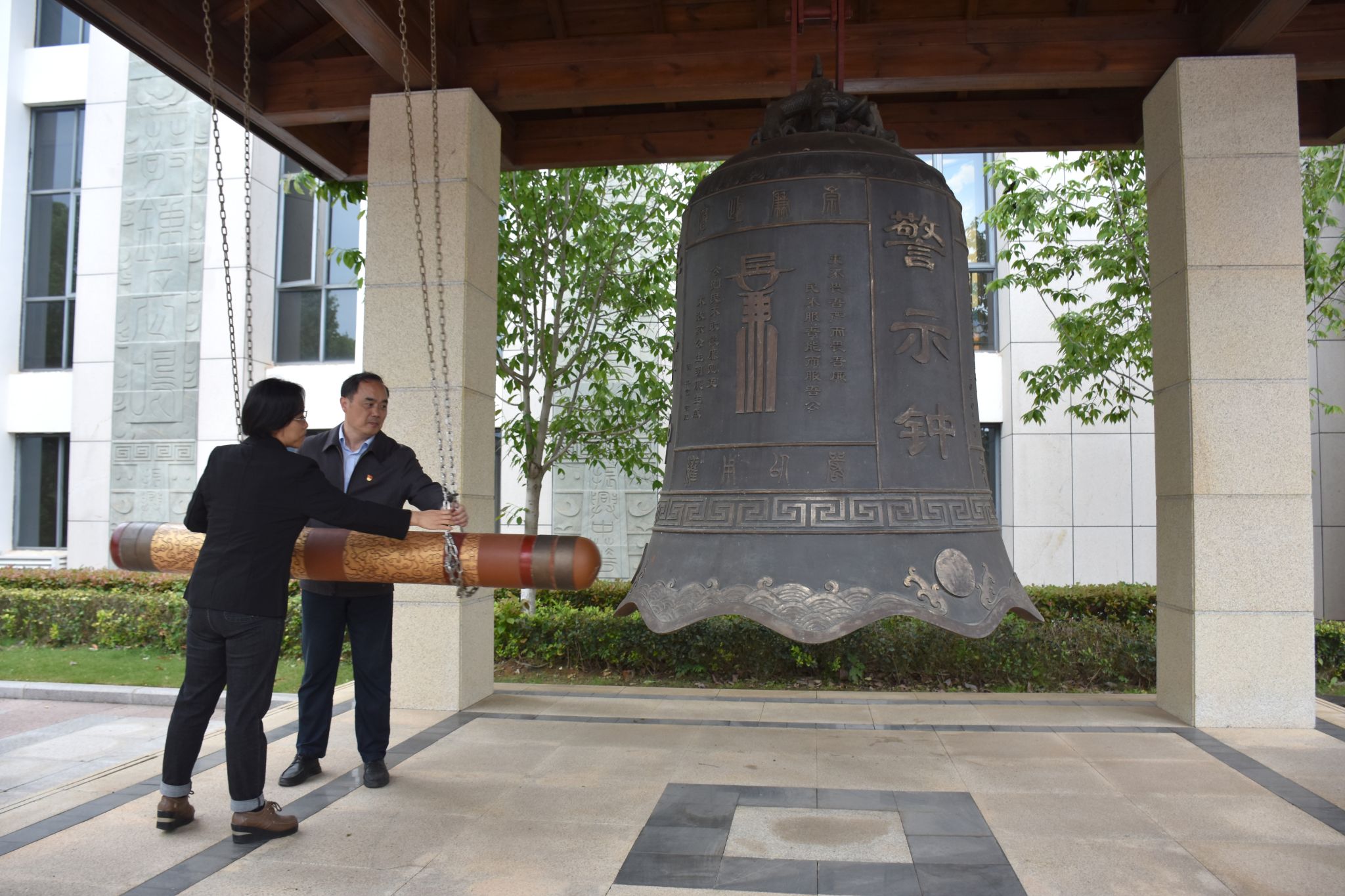 参观完展馆后,全体师生党员来到警示钟前,举行庄严的敲响警示钟仪式。由校园规划与基建处处长李鹏翔与公司党委书记李红丽共同敲响警示钟,警示党员干部要学纪、知纪、明纪、守纪,营造风清气正良好政治生态。