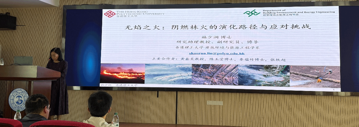 林少润博士的报告以“无焰之火:阴燃林火的演化路径与应对挑战”为题,从阴燃介绍、阴燃泥炭火介绍、泥炭的点火及火蔓延特性、气候变化加剧下的阴燃泥炭火及其碳排放,以及泥炭火的应对策略与挑战五个部分展开讲述。他以印度尼西亚森林大火等诸多现实案例为大家介绍了地球上尺度最大的燃烧与火灾现象——阴燃泥炭火,讲述了如何通过实验手段研究泥炭的点火及火蔓延特性,并着重分析了利用窒息、冷壁熄火、降雨、降雪等理论和方法抑制泥炭阴燃的可行性,还借助开源代码Gpyro建立了二维数值模型,研究了阴燃燃烧的影响因素,为阴燃林火动力学和灾害防治提供了思路和参考,促进了火灾安全应用技术的发展。讲座尾声,林博士展望未来,指出阴燃泥炭火受飞火影响蔓延的问题尚未解决,阻止此类火蔓延的措施仍有待研究,这或将成为未来研究方向。