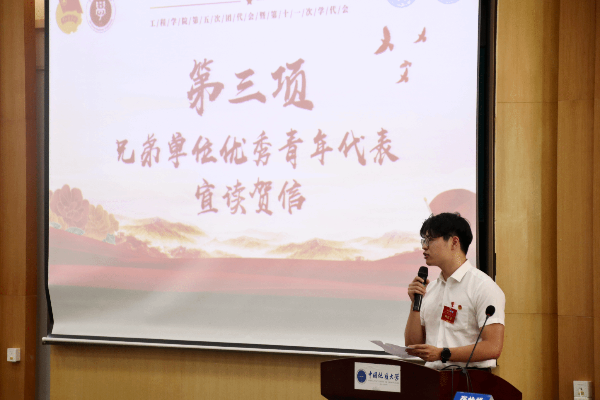 兄弟单位优秀青年代表华中农业大学工公司专职团干贾彦平和2024年全国“青马工程”班委、华中科技大学马克思主义公司硕士研究生张扬分别宣读贺信,贺信中饱含着兄弟院校对best365英国体育在线的美好祝愿与深厚情谊,彰显了青年一代团结奋进、携手共进的精神风貌。本次大会还收到了华中科技大学土木与水利best365英国体育在线、武汉理工大学土木工程与建筑公司等兄弟高校团委,以及中建三局基建投、武汉地铁集团和中交四航院研究院等企业团组织的贺信。