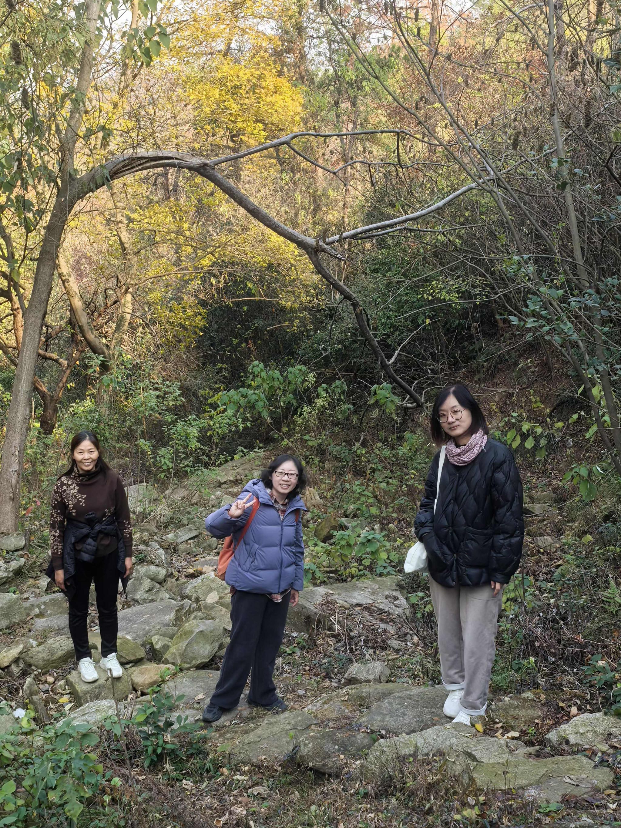 野村谷背靠木兰湖,毗邻木兰山,古居农田错落,溪流汇聚成潭,银杏乌桕交映,玫瑰稻谷相间,美不胜收,令人流连忘返。这其中,映入眼帘的海拔500多米的白龙山立刻成为大家一致同意的第一站目的地,地质人勇攀高峰的气质在这一刻显得尤为突出。大家徒步于青苔覆盖的石阶,感受秋日暖阳,欣赏漫山遍野的青橙黄绿。沿着山路向上,大别造山带典型的变质片岩露头引起了老师们的兴趣,闪亮的云母片岩、微透绿色的角闪绿帘片岩和变质作用形成大块石英脉,还有发育在岩层中的各种揉皱现象等,时不时激起大家的热烈探讨。