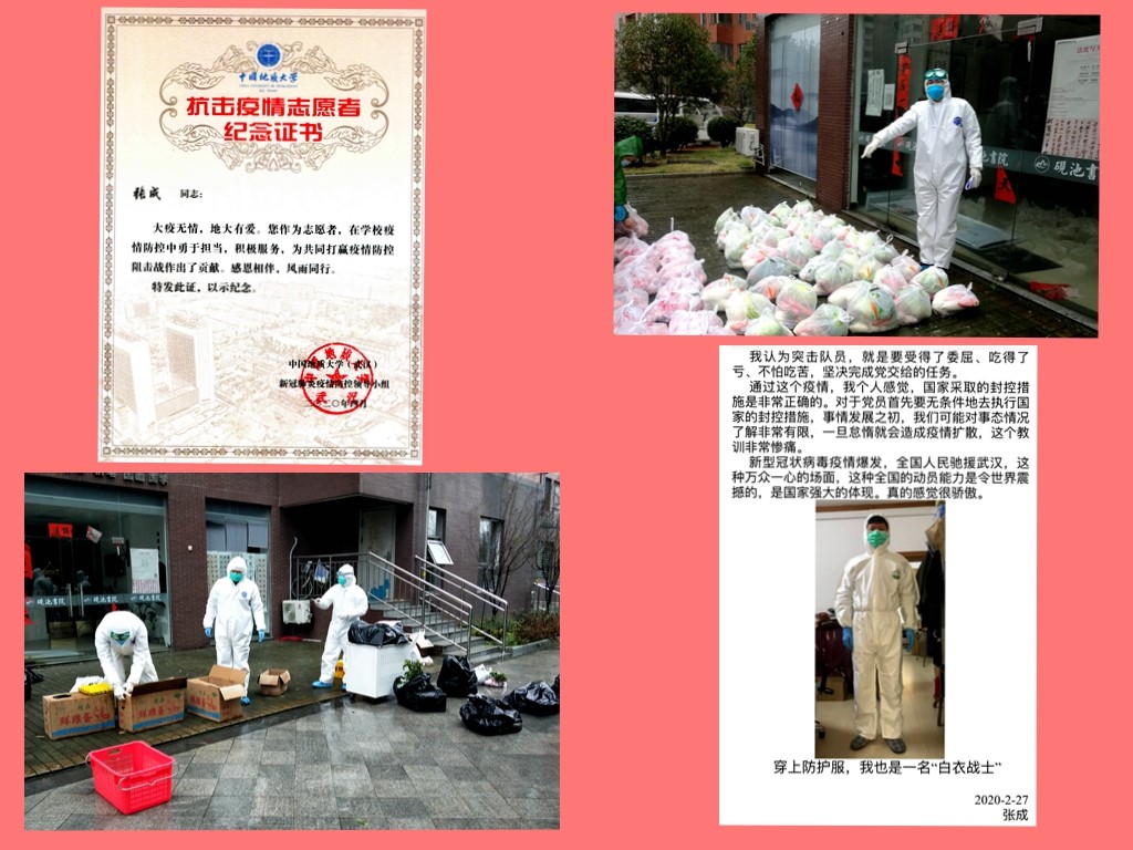实验中心党支部宣传委员张汉斌同志,疫情爆发前回到四川成都,准备与亲人们欢度春节,突然爆发的新型冠状病毒疫情,迫使他滞留成都近九十天。在得到武汉封城、成都开展全面防控的消息后,立即主动陪父亲一起到锦江区五福桥社区进行了外来人员登记报备。居家隔离期间,每天上午、下午按时检测体温并上报社区疫情防控小组。在结束十四天的隔离观察,取得成都市健康证明后,张汉斌同志主动联系社区临时党员突击队,配合社区党员同志们开展疫情防控宣传工作,并利用自己摄影特长,对成都疫情防控工作进行了跟踪拍摄记录,受到了社区的充分肯定和表彰,成都电视台还做了相关采访报道。四月中旬,和父亲终于回到了阔别三个月武汉,再次接受了为期十四天的居家隔离观察。在实验中心复工期间,听从领导安排,做好研究生科研实验准备。同时,用镜头捕捉记录公司抗击疫情中重大事件,全校集体核酸检测、毕业生毕业典礼等多幅照片被校宣传部采用,为公司积极防控抗疫宣传工作,做出了应有的贡献。